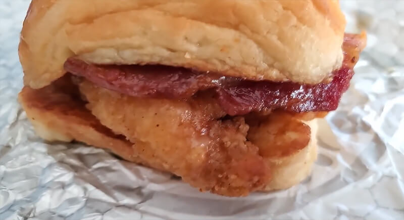 This sandwich is close to great, but the parts don’t always sync. A juicy chicken filet, smoky bacon, and maple butter sit between croissant halves. But the croissant’s spongy texture and the overly sweet maple flavor drag it down.