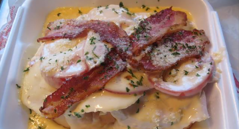 The Hot Brown is Kentucky’s version of a warm, open-faced sandwich that really hits the spot. It starts with a slice of toast topped with roasted turkey and crispy bacon. Then it’s covered in a creamy cheese sauce called Mornay and placed under the broiler until it’s golden and bubbling.