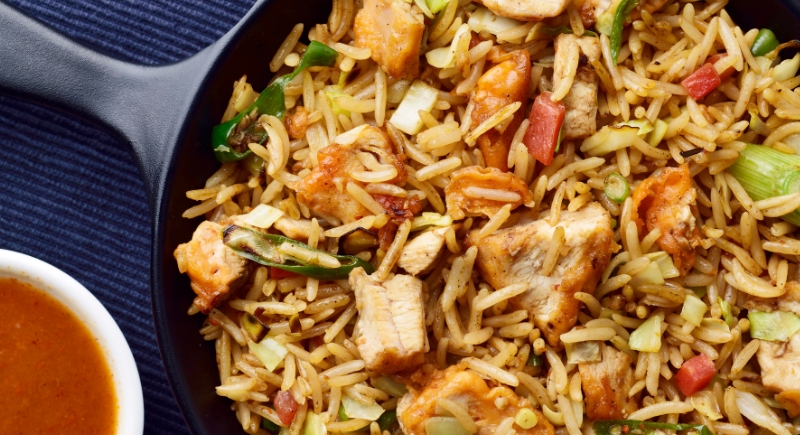 Quick, hot oil hitting cold rice: this is where chicken fried rice begins. The grains fry until separate, then soy sauce, vegetables, eggs, and chicken complete the dish. It was invented as a way to stretch leftovers, but its speed and balance of protein, carbs, and fat made it popular far beyond its origins. Today, it’s one of the most universal meals served from woks to takeout boxes.