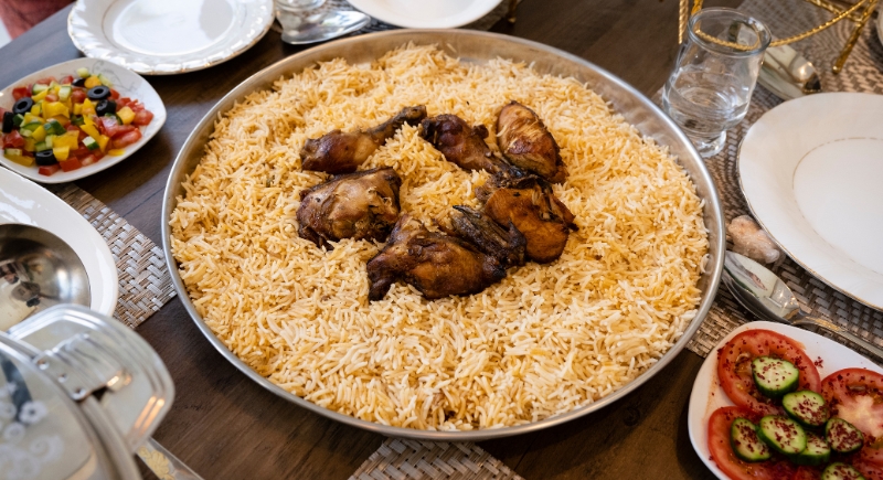 Kabsa is a signature dish in Saudi Arabia, often prepared for weddings and large gatherings. Chicken and basmati rice cooked in a spiced tomato broth scented with cardamom, cinnamon, and dried lime. Before serving, cooks scatter raisins or nuts on top for texture and sweetness. Traditionally placed in the center of the table, kabsa is eaten from a shared platter, emphasizing hospitality and community.