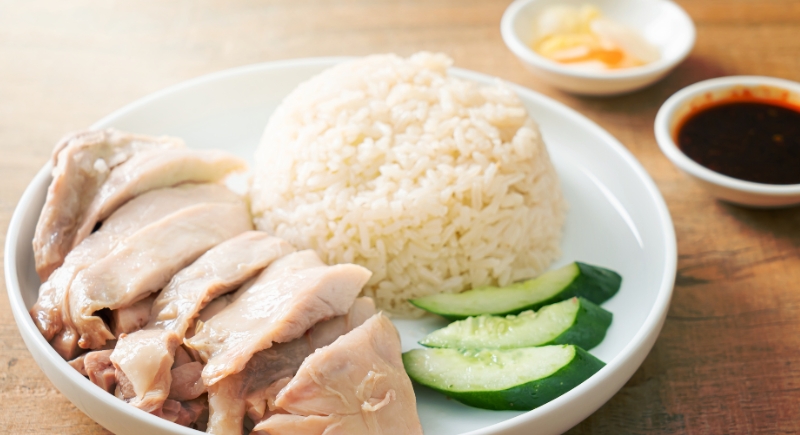 At hawker stalls across Singapore, plates of chicken rice move faster than almost anything else. The chicken is poached until tender, then sliced and served with rice that has been cooked in the same broth. On the side come sauces—ginger, chili, soy—that let each bite shift in flavor. A few cool slices of cucumber finish the plate, a small detail that keeps the meal crisp and balanced.