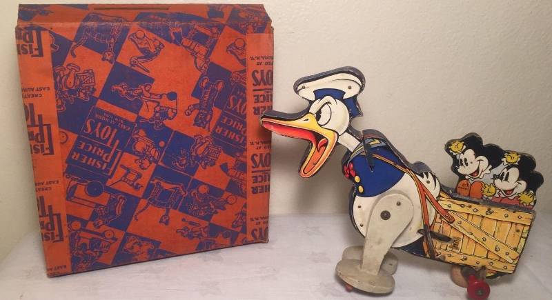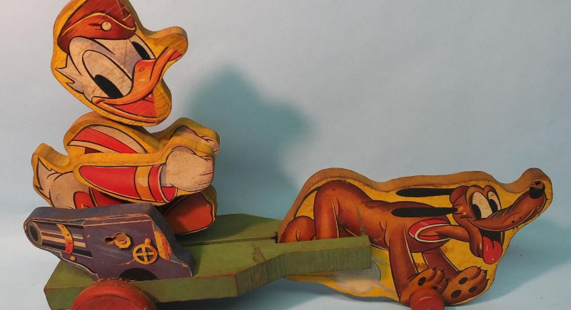 This early version of Donald Duck on wheels was made sometime before World War II. Its hand-painted wood construction and unique style keep it in demand today. A single piece with some scuffs still sold for $975 on eBay in 2023.